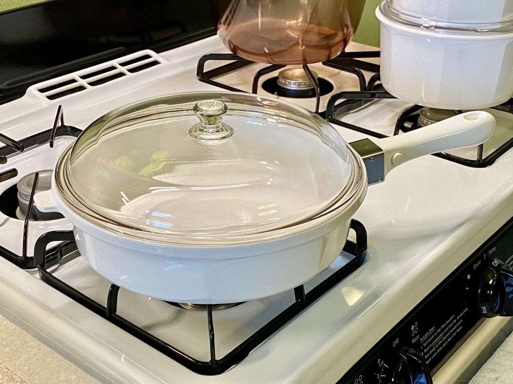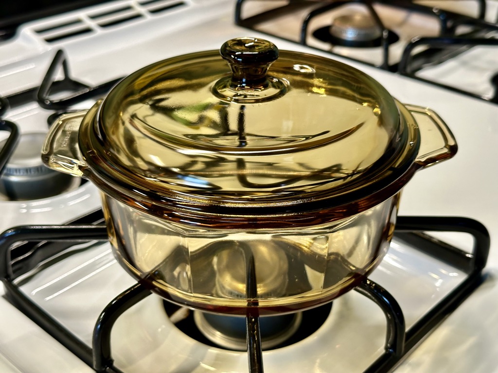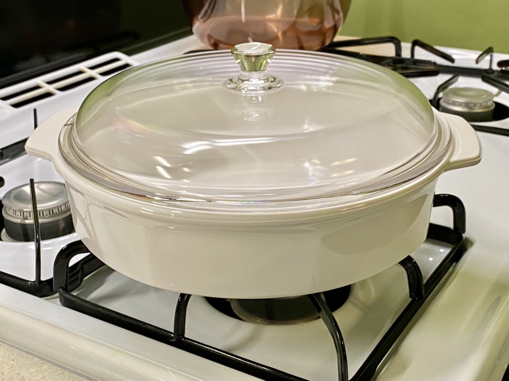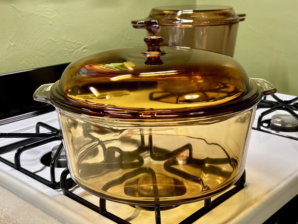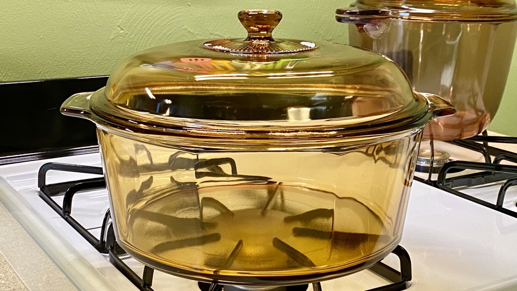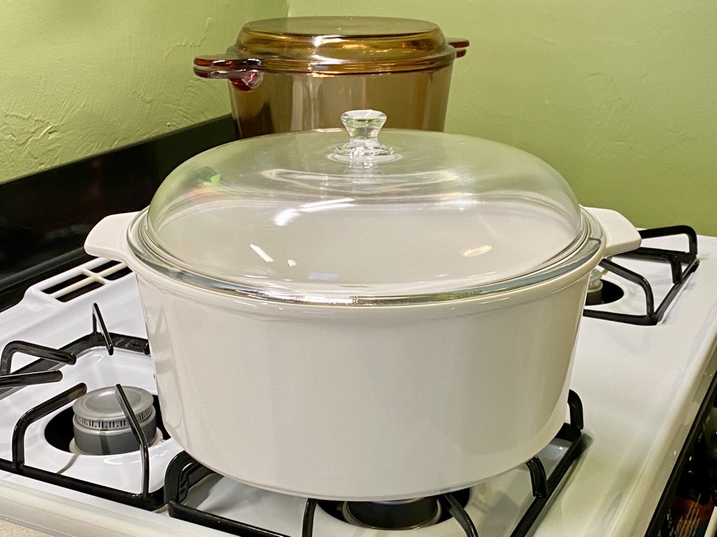 Select white pieces were rebadged as "Nouveau" cookware and distributed by Princess House in the 1990s-2000s. In 2010-2011 both white and amber casseroles were distributed under Corning Ware and Visions brands, respectively.