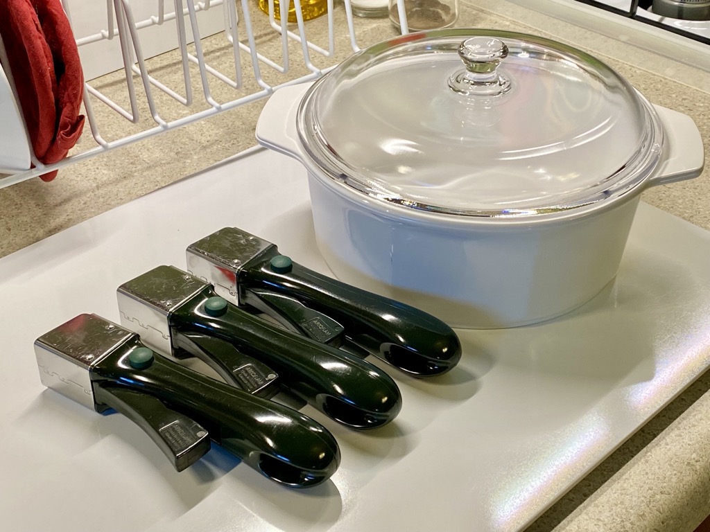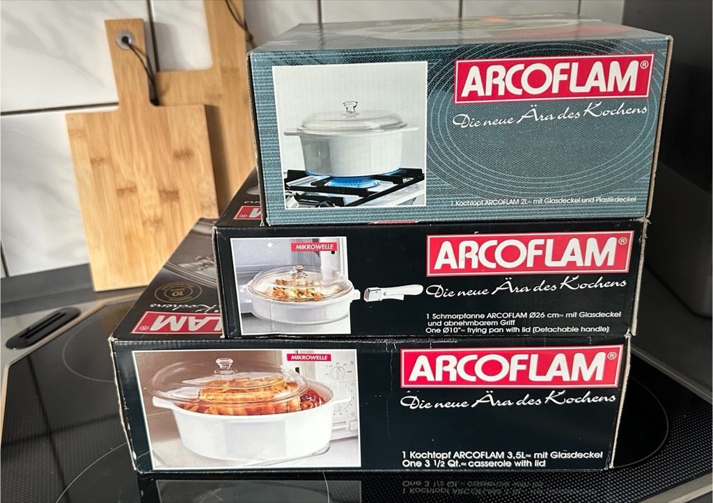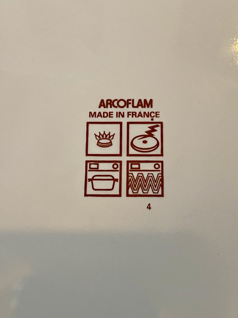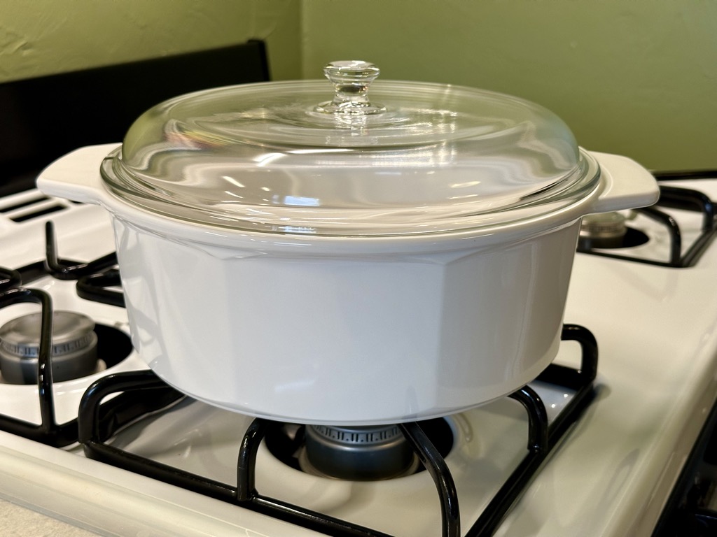 Introduced in 1986, the Octime cookware collection features a sophisticated eight-sided beveled appearance. Casseroles are available in both Amber and White, with the latter being more common overall. Only white saucepans have been found and feature the same detachable handles as originally used with Trianon. The handles were offered in numerous colors including white, blue, brown, black, and green. Originally sold under the Arcoflam brand name, newer examples have been offered under Luminarc and Arcoroc.