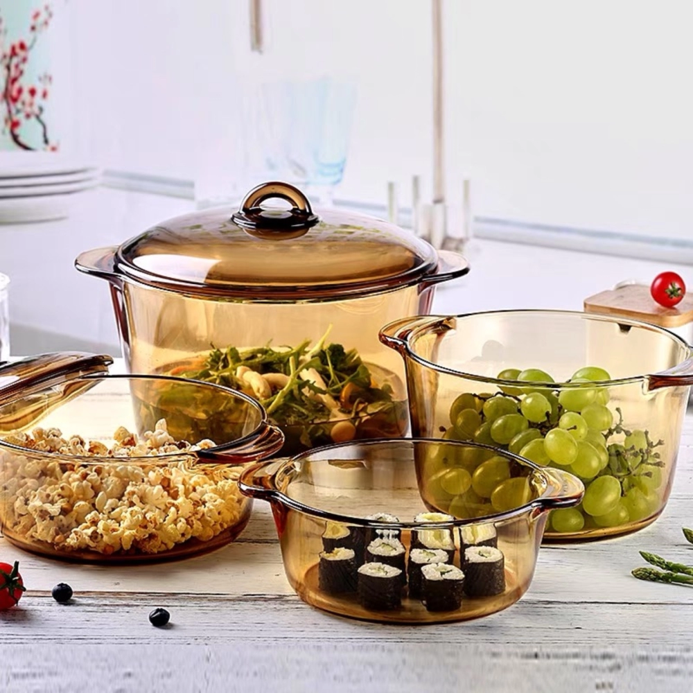 Around 2017, multiple Vitro casseroles were revised to include a patterned, textured base. These are labeled "Granite" in select regions. The Granite casseroles were also sold under the Visions brand in 2021.