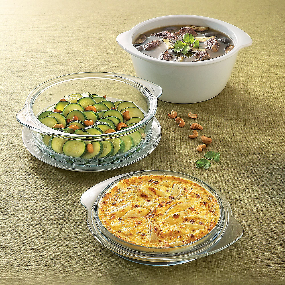 A 2.4L casserole was offered with uniquely designed lug handles. This piece was also bundled with a matching glass steamer, and other accessories, under the Pyrex Multicook name for Europe.