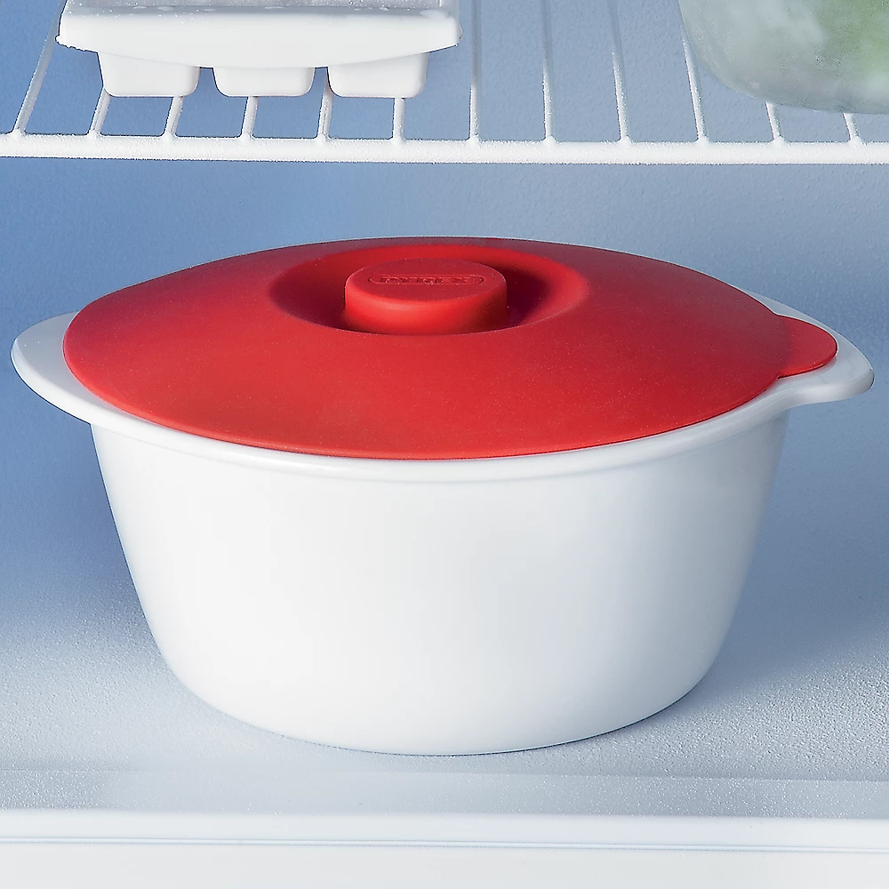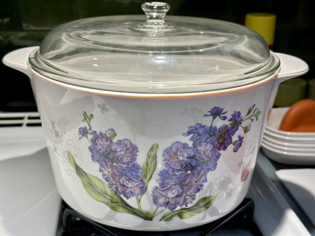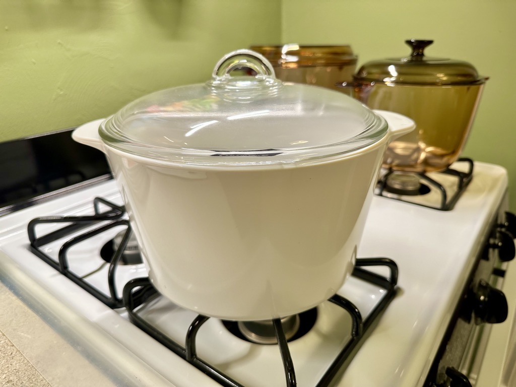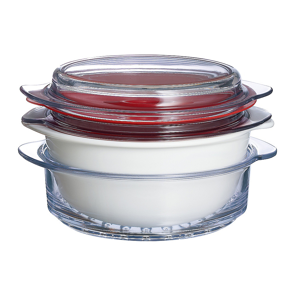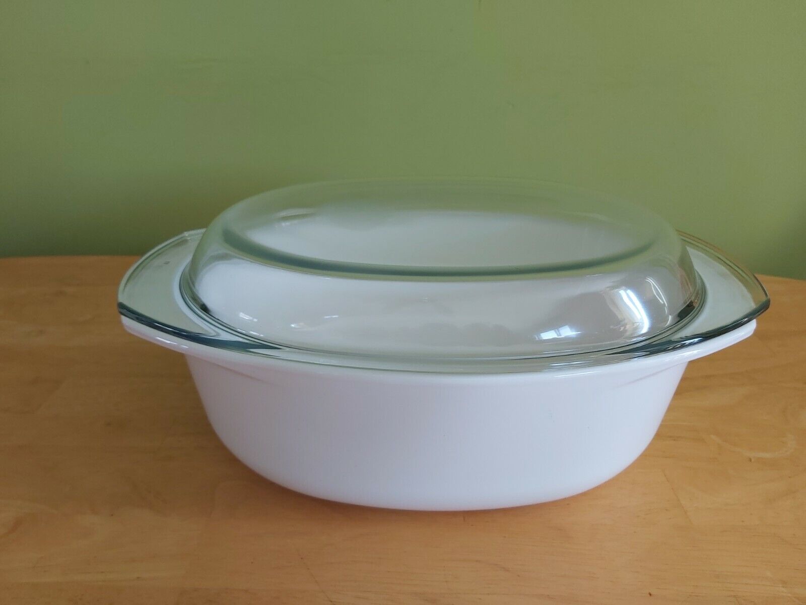 A 2.4L casserole was offered with uniquely designed lug handles. This piece was also bundled with a matching glass steamer, and other accessories, under the Pyrex Multicook name for Europe.