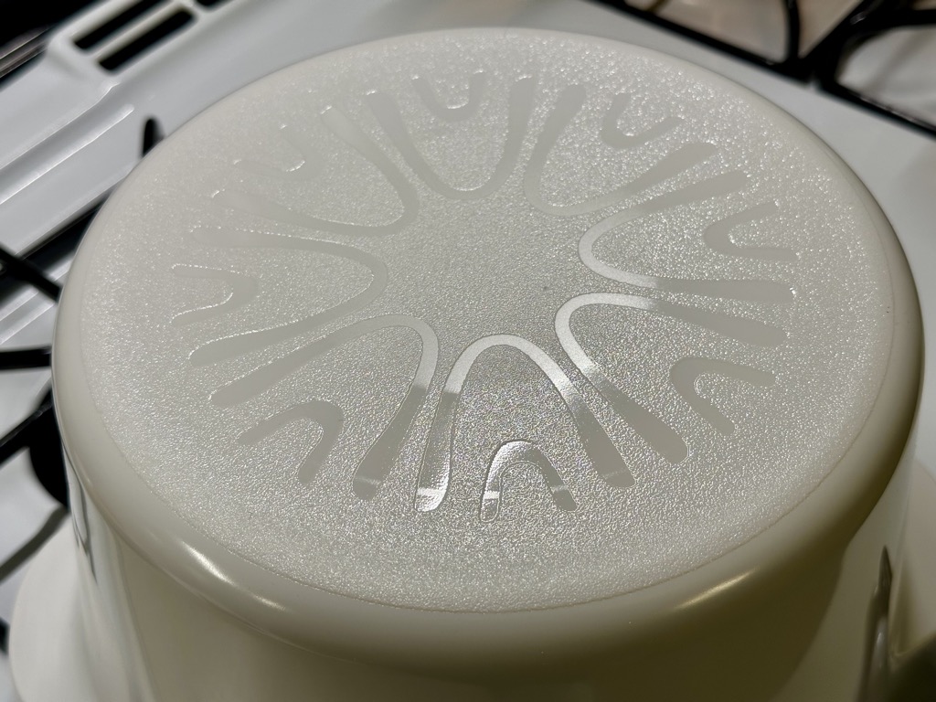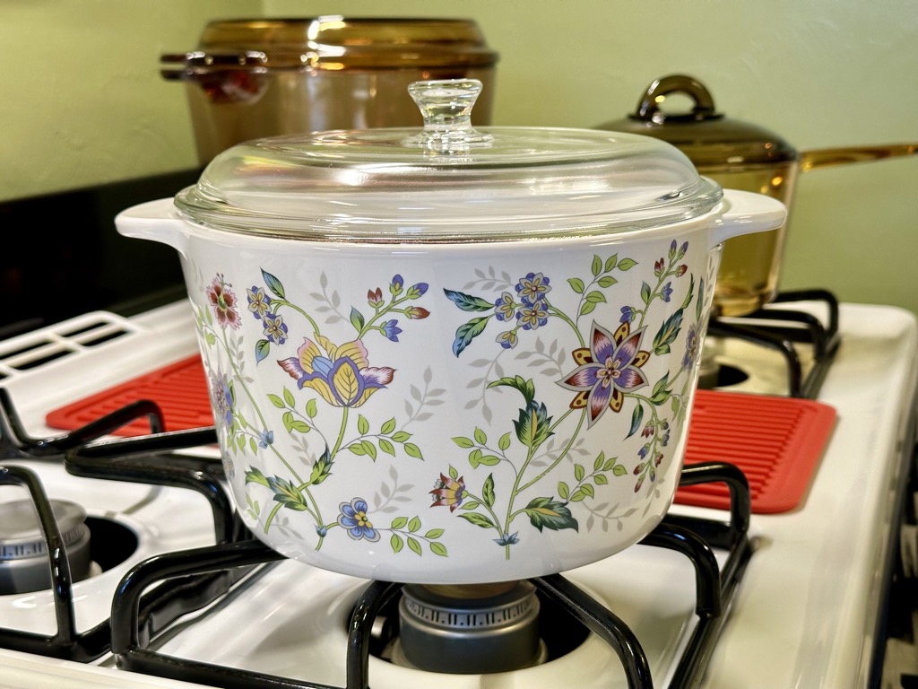 Around 2017, multiple Vitro casseroles were revised to include a patterned, textured base. These are labeled "Granite" in select regions. The Granite casseroles were also sold under the Visions brand in 2021.